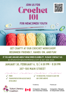 Join us for 3 days of a beginner-friendly, hands-on introduction to crocheting. Our dates are January 30th, February 6th and February 13th from 6:30 to 8:30pm. Please see our poster below for further information. If you have any questions, please contact sihyeon.kim@yukonliteracy.com.