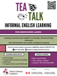 This is a conversation group for newcomer ladies who are looking to practice English and meet new people. We meet every Monday evening at 7pm at the Family Literacy Centre on Front Street. Please reach out if you have any questions!